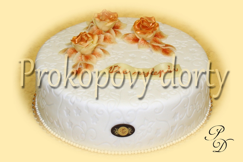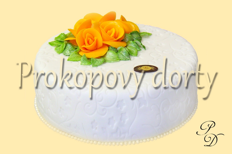 Popis: Dortový korpus protažený lehkým máslový krémem (chuť dle přání), potažený bílou modelovací hmotou, dekorovaný ornamenty, bordura modelovaná čokoládové růže, modelované lístky.