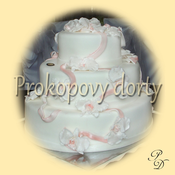 Popis: Dortový korpus protažený lehkým máslovým krémem, chuť dle přání, potažený bílou modelovací hmotou, dekorovaný modelovanými bordurami, stuhami a modelovanými orchidejemi.
