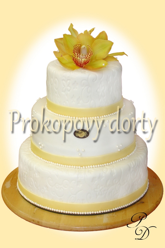 Popis: Dortový korpus protažený lehkým máslovým krémem, chuť dle přání, potažený bílou modelovací hmotou, na dvou patrech dekorovanou, modelované bordury, jedlé korálky, květ orchideje.