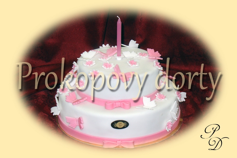 Popis: Piškotový korpus protažený lehkým máslovým krémem (chuť dle přání zákazníka), potažený a dekorovaný bílou a barvenou modelovací hmotou, jedlé korálky.