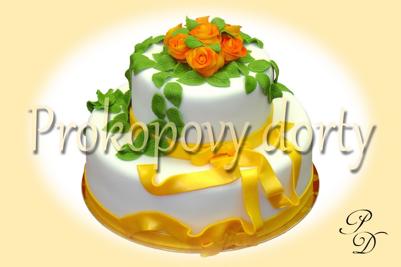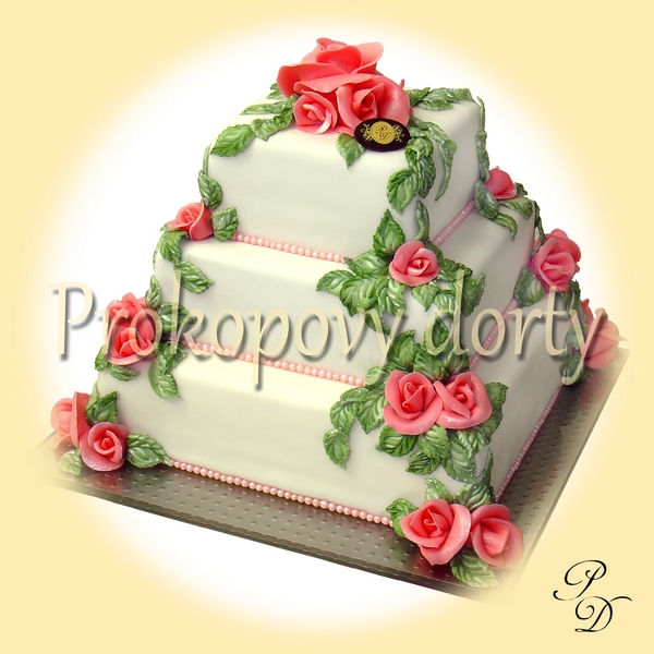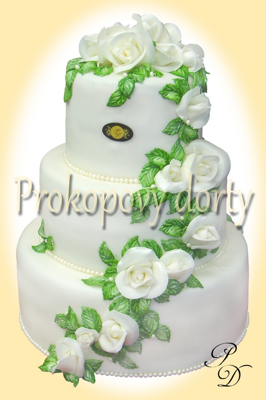 Popis: Dortový korpus protažený lehkým máslovým krémem, chuť dle přání, potažený bílou modelovací hmotou, dekorovaný modelovanými růžemi, lístky, jedlými korálky.