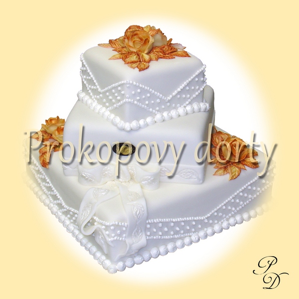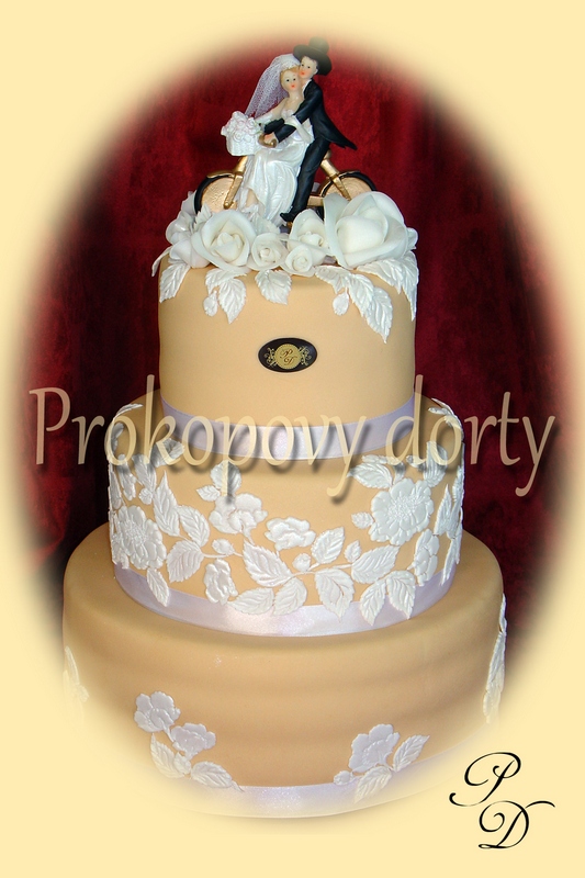 Popis: Piškotový korpus protažený lehkým máslovým krémem, potažený bílou modelovací hmotou, dekorovaný barvenou modelovací hmotou (růžičky, lístky, bordura). Figurka svatební plastová.