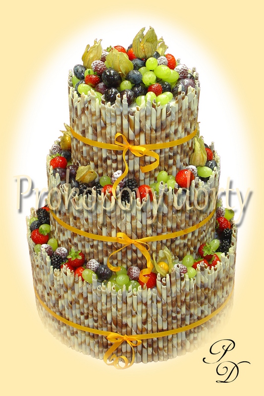 Popis: Dortový korpus protažený lehkým máslovým krémem nebo moussem, chutě dle přání. Dekorace čokoládové tyčinky, čerstvé ovoce.