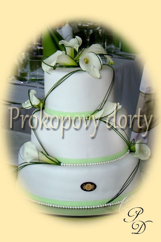 Popis: Piškotový korpus protažený lehkým máslovým krémem (chuť dle přání zákazníka), potažený bílou modelovací hmotou, modelované lilie, jedlé korálky.