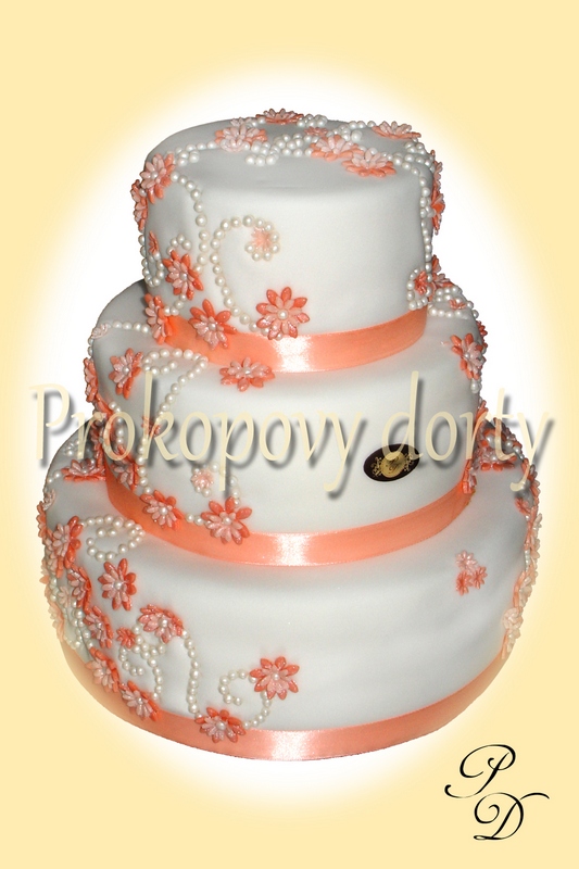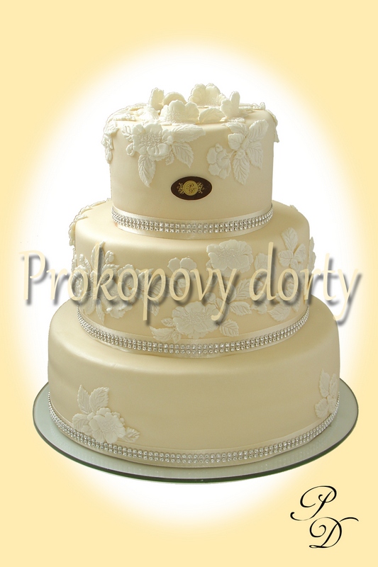 Popis: Dortový korpus protažený lehkým máslovým krémem, chuť dle přání, potažený bílou modelovací hmotou, modelovaným závojem, dekorovaný květy, jedlé korálky.