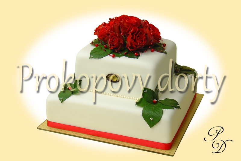 Popis: Dortový korpus protažený lehkým máslovým krémem, chuť dle přání, potažený bílou modelovací hmotou, dekorovaný modelovanými růžemi, lístky, jedlé korálky.