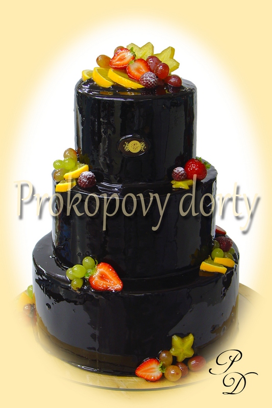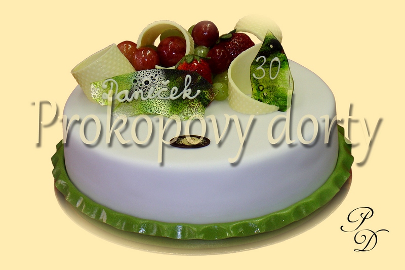 Popis: Piškotový korpus protažený lehkým máslovým krémem (druh dle volby zákazníka), modelovací hmota bílá, bordura z modelovací hmoty, čerstvé ovoce, čokoláda, cedulka z cukrového "skla"