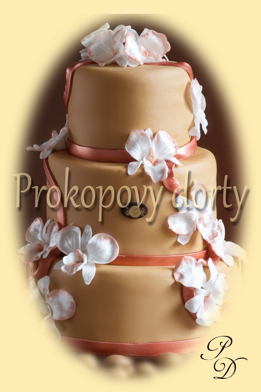 Popis: Dortový korpus protažený lehkým máslovým krémem, chuť dle přání, potažený barvenou modelovací hmotou, dekorovaný modelovanými bordurami, stuhami a modelovanými orchidejemi.