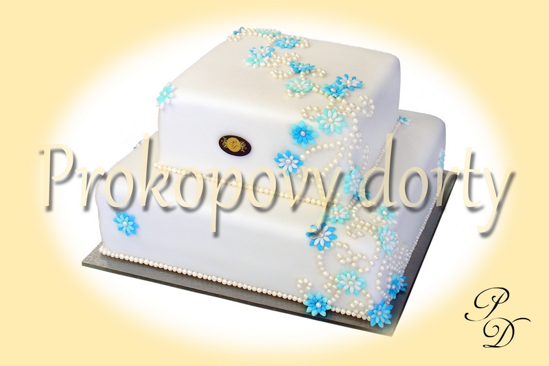 Popis: Dortový korpus protažený lehkým máslovým krémem, chuť dle přání, potažený bílou modelovací hmotou, dekorovaný modelovanými bordurami, kvítky, jedlými korálky.